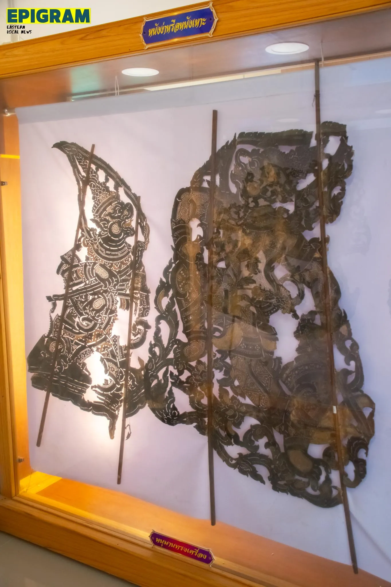 ภายในอาคารพิพิธภัณฑ์ จัดแสดงตัวหนังใหญ่ ห้องประชุมเพื่อรับฟังคำบรรยายและชมวีดีทัศน์การแสดงหนังใหญ่ ปัจจุบันหนังใหญ่ที่เคยมีอยู่จาก 200 ตัว ได้ผุพังไปบ้าง จึงได้มีการทำเพิ่มเติมอีก 77 ตัว และใช้เล่นแสดงร่วมกันกับหนังใหญ่ชุดเดิม เรื่องที่นิยมแสดง คือ เรื่องรามเกียรติ์ อิเหนา เป็นต้น ตัวหนังสำคัญที่จัดแสดงไว้ คือ